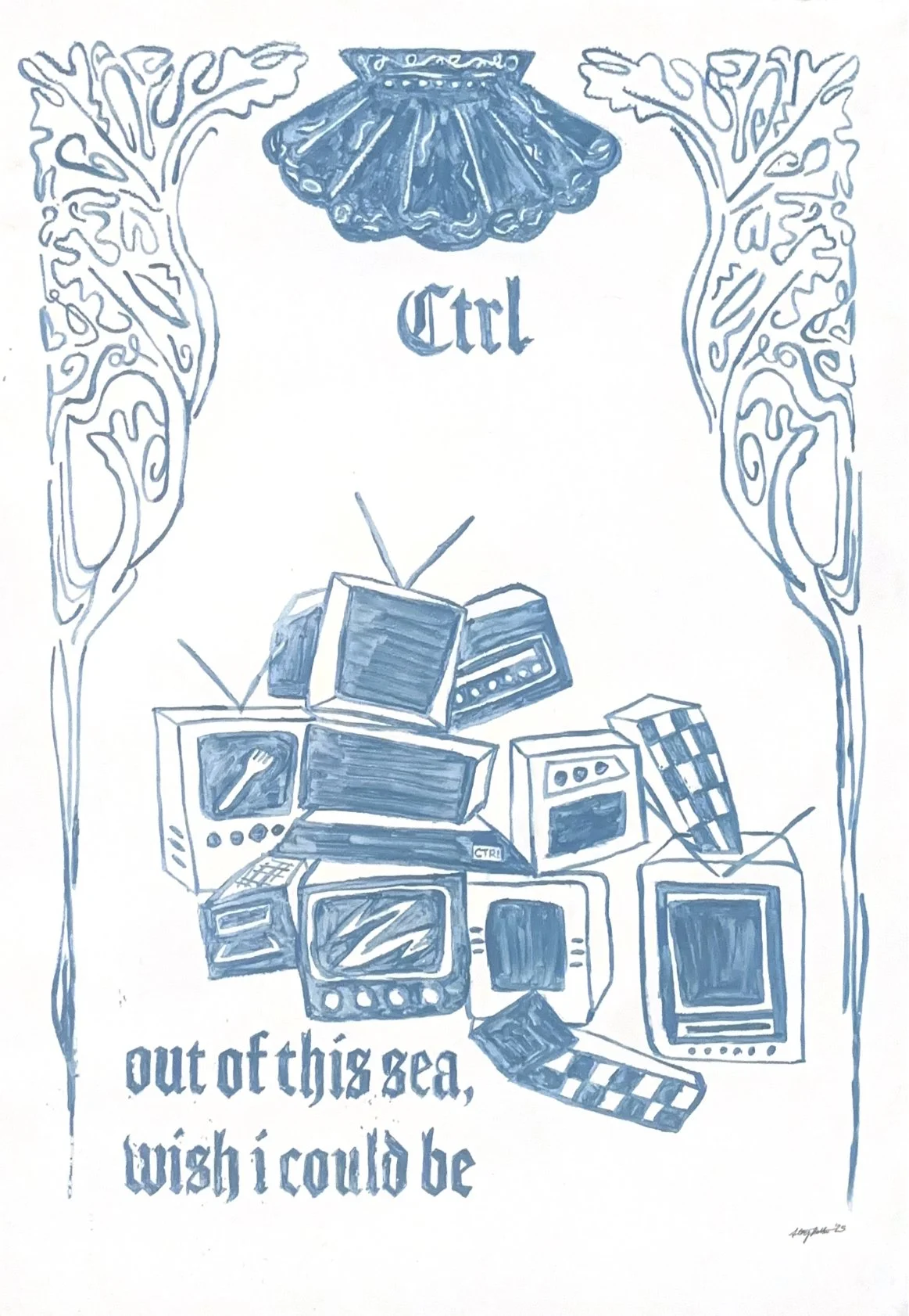 For me, as a little girl, The Little Mermaid was everything. I admired her carefree spirit and bubbly personality; she was always on the move, searching for a new experience. I chose to include the phrase “Out of this sea, wish I could be” to resemble the ambitious dream young girls have and how they carry it with them growing up, working to make it a reality. The broken TV and static come from SZA’s CTRL album cover, which are the trials and tribulations we face on the road to our future, and the bumps in the road we must overcome to carry on.
