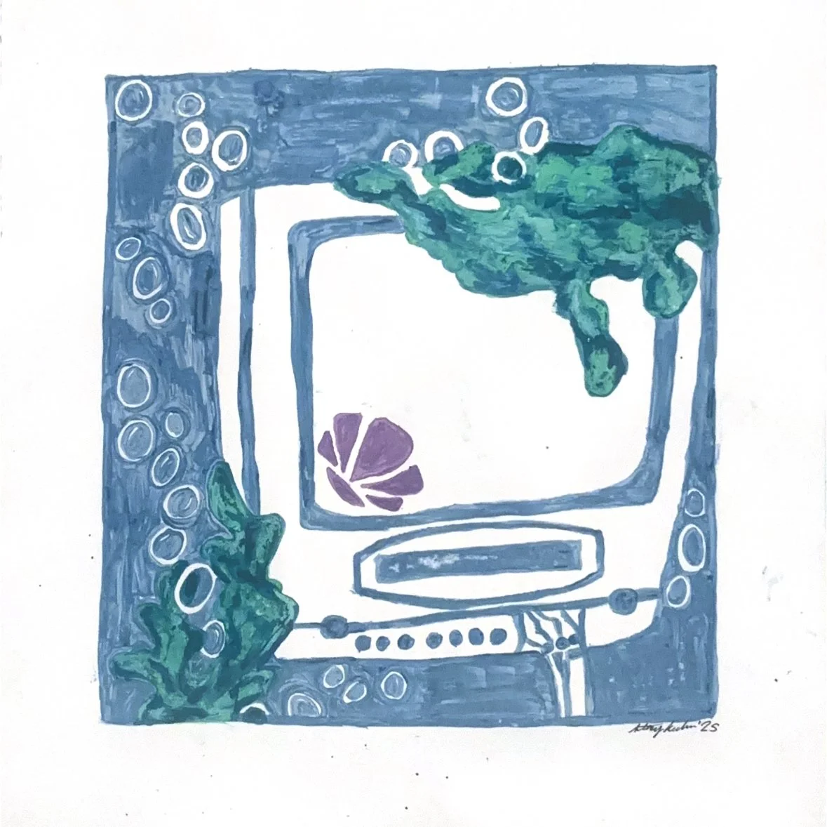 For this second print, I took inspiration from the old VHS TVs. Old technology and the simple living of children were something that was so normalized before the high-speed and wireless electronics took over. Nowadays, we see not only children and young adults glued to their cell phones but adults as well. We lose track of simple living and enjoying a feel-good movie at the end of a long day, playing outside with your feet in the grass. This is visualizing an abandoned TV left to sink to the bottom. Collecting seaweed and algae, showing the progression of time from being a child growing up into a young adult and losing sight of your inner child.